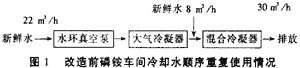 改造前磷銨車間磷銨熱風機及料漿循環泵冷卻水(約10m3/h)直排;水環真空泵、大氣冷凝器和混合冷凝器的冷卻水順序重復使用,使用情況見圖1。