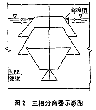 ①由于廢水處理設施正好位于原有的池塘上,其地基承載力和土質均勻度都很差,如采用鋼筋混凝土結構,由于其自重大,地基處理費用就相當高。厭氧罐和貯氣柜設計采用德國引進的Lipp罐體,由于罐體自重輕,基礎比較容易處理,費用隨之降低。厭氧消化罐高為9 m,直徑為7 m,是地上式圓形Lipp罐。由于對厭氧消化罐的徑、高比進行了調整,原有的三相分離器就不是很適合。因此,對三相分離器進行了重新設計,采用三層鋼結構漏斗式導流板做三相分離器(見圖2)。從使用結果看,三相分離效果相當好,厭氧污泥流失量很小,污泥截留效果明顯。