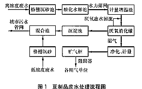 根據豆制品廢水的特點及經處理后的廢水接入城市污水管網的要求,對高濃度廢水采用酸化水解—厭氧消化處理工藝,充分利用其能耗低、處理效率高、耐負荷并能產生沼氣等特點。