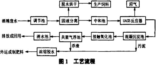 酒精廢水是富含營養成分的酸性高濃度有機廢水,處理難度較大。因此,廢水處理應從清潔生產,資源綜合利用的角度出發,降低廢水的處理難度。除了從酒精生產工藝中挖掘潛力,由濕法生產代替傳統的全粒法,減少廢水中脂肪、蛋白質的含量,降低廢水處理難度外,還要在廢水處理工藝上選擇能回收利用廢水中的有用成分、處理效果好、運行穩定的處理工藝。根據工程經驗和小試、中試結果,確定了如圖1所示的酒精廢水處理工藝。