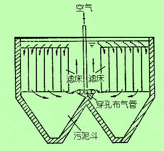生物接觸氧化池內設置填料,填料淹沒在廢水中,填料上長滿生物膜,廢水與生物膜接觸過程中,水中的有機物被微生物吸附、氧化分解和轉化為新的生物膜。從填料上脫落的生物膜,隨水流到二沉池后被去除,廢水得到凈化。在接觸氧化池中,微生物所需要的氧氣來自水中,而廢水則自鼓人的空氣不斷補充失去的溶解氧?諝馐峭ㄟ^設在池底的穿孔布氣管進入水流,當氣泡上升時向廢水供應氧氣,有時并借以回流池水。參見圖2。圖2 集中布氣式浸沒曝氣生物濾池