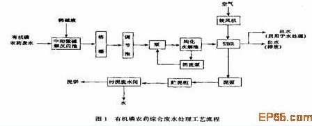 各股酸性、堿性有機磷農藥廢水進中和池進行中和,然后加稀堿液調整pH,進行微堿解脫毒處理。堿解后廢水經格柵進入調節池,調節后的廢水經泵均勻提升至均化水解池。廢水是否需要進行均化水解強化預處理,視進水情況而定,若進水污染負荷不太高,可不進均化水解他,將廢水直接由調節油泵送至SBR(Sequencing Batch Reator,序列批量式反應器),采用鼓風機及潛水曝氣攪拌機聯合充氧,處理后的廢水部分回用,余者外排。