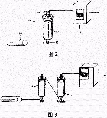 圖2說明本發明的模范方式。本發明在如一個容器的濾筒1中被物化,該容器包括一個人口15和一個出口l6以及不滲透性的側壁17。該濾筒擁有一個金屬顆粒和聚磷酸鹽晶體的床。出口和人口位于濾筒的端部使水流過管線18并與合成的介質接觸。這種水從濾筒流出后流人加熱器19。另一種可能性是使用兩種濾筒,如圖3說明。具有聚磷酸鹽的1a和具有金屬顆粒的1b串聯(如圖)或并聯(圖中未顯示)。