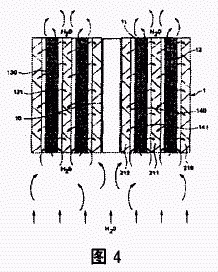 圖4介紹了在濾筒或水處理容器中固定顆粒物質的優選方案。該濾筒可以是一種中空圓柱體1,濾同中心有一個柱心10,金屬顆粒和聚磷酸鹽l1,12的圓柱層通過一對圓柱形多孔紙130,l3l,140,l41支撐層固定紙可以由薄的多孑L聚合材料層取代。選擇支撐層的多空性是為了維持顆粒層在適合的位置防止微粒從層中穿過。支撐層周圍是增加湍流裝置,如網狀物210,21 1,212,它們由聚合材料組成,如聚乙烯、聚丙烯或任何其它的適合的食品級惰性塑料。每個支撐層的外表面最好有一部分網狀物包圍。例如,網狀物可以位于接近支撐層的位置,鋪開形成圓柱形狀,而后置于圓柱形濾筒中。這種網狀物可以促使水流橫向或切線方向流動,阻止縱向流動。網狀物因此可以維持水的湍流。網狀物空的大小范圍在0.1—10mm之間,比較好的在1 5mm,最好為2 3mm。其它適合的材料也可取代網狀物結構提供相似單向流動作用,如蜂巢等。