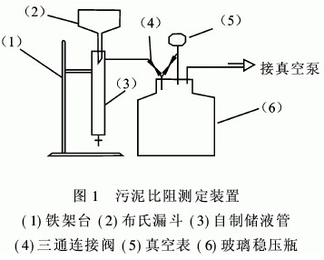 在定壓下(采取抽真空方式,真空度一般為0。05MPa) 對污泥進行抽濾,通過測定一系列的t~V數據,然后在直 角坐標系下作t/ V~V關系圖,得b;通過烘干截留的濾 餅,稱重得到濾餅總量W,再除以總體積V,得w.根據公 式r=2PA2b/uw即可以得到污泥比阻r。污泥比阻抽濾測定裝置如圖1所示[1]。