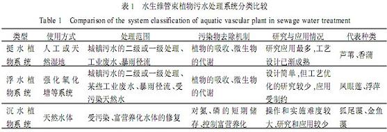 凡生長在水中或濕土壤中的植物,以大型的草本植物為主,包括水生、濕生和沼生植物,稱為水生植物(hydrophyte)[5]。水生植物主要包括3大類:水生維管束植物、水生蘚類和高等藻類。在污水治理中應用較多的是水生維管束植物,它具有發達的機械組織,植物個體比較高大,可分為挺水、浮水和沉水3種生活型[6],這3種類型的水生植物在污水處理系統中存在一些不同的應用方式,詳見(表1)。