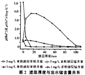 分層取樣為過濾開始lh后取樣,進水亞鐵質量濃度分別為 lmg/L和5 mg/L,PH為6.5,溶解氧大于5 mg/L。試驗發現,濾層中部的含錳量均超過進水的含錳量,特別在進水含鐵量較高時(5 mg/L)更甚,到濾層下部才逐漸降低。筆者推測,出現這種情況的原因可能是高濃度的鐵阻礙了細菌對錳的攝取,破壞了除錳濾膜的平衡,使濾膜脫落,濾層中部的含錳量從而升高。脫落的濾膜被下層濾砂吸附,錳含量又逐漸降到正常的水平。這也許就是除錳一般發生在含鐵量微乎其微的二級濾柱或一級過濾中濾柱下部的原因。