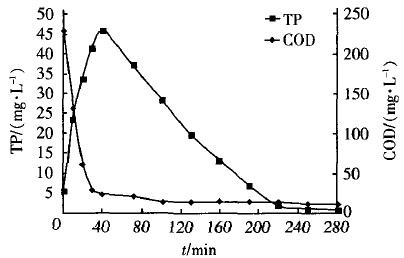 由圖2可知,在厭氧結束后,COD由228.64 mg/L迅速降至22.61 mg/L,去除率約為90%,與此 同時,總磷由5.62 mg/L上升至46.04 mg/L,釋磷 量為40.42 mg/L,平均釋磷速率為60.63 mg/(L· h)。這主要是因為,反硝化聚磷菌分解體內的多聚 磷酸鹽,并以主動運輸方式吸收有機物,將其合成 PHB,同時釋放出無機磷。這樣,釋磷越多則合成的 PHB就越多,表現為被消耗的有機物就越多。COD 的有效快速降解,不僅使PHB得到積累,亦為后續 的吸磷提供了充足能量,同時也使COD在厭氧段得 到高效去除。而在隨后的好氧段中,反硝化聚磷菌 以NO:-為電子受體,其氧化胞內PHB時所產生的 能量被ADP獲得,并結合外界環境中的H。P0 合成 ATP,從而進行細胞合成和維持生命活動。此時由 于H PO 被過量攝入細胞體內,從而達到從污水中除磷的效果。因此,在好氧段結束后,反應器中的COD最終降至10.05 mg/L,去除率達到95.6%,TP 最終降至0.63 mg/L,去除率達到88.8% 。