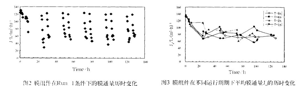 2) 考察了膜組件的分離/ 曝氣交替運行周期對連續運行過程中膜過濾性能的影響。當交替運行周期由6h 變化到1h ,初始膜通量在60~140 L·(m2·h) - 1變化時,系統在連續運行過程中每一運行周期內的平均膜通量均首先經歷了初始的下降階段,然后基本穩定在50~80L·(m2·h) - 1左右的水平,但低的初始膜通量可以使平均膜通量表現出更好的穩定性。