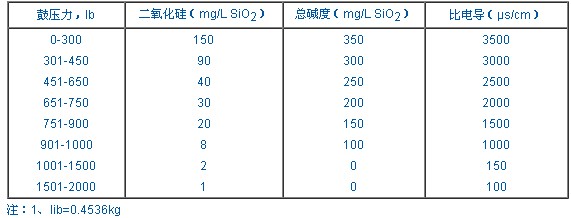 表1列出了為保證現代鍋爐連續、可靠地操作,鍋爐水雜質的最高含量指標。由于鍋爐水質隨壓力變化,因此該表僅作為大體的指南。每一個系統的特殊性質,包括鍋爐的設計和渦輪機的現狀,對于適宜保持的水質極值也有重大的影響。
