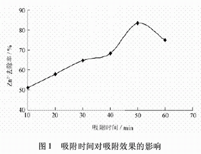 從圖1可以看出,隨著吸附時間的增加,Zn2+的去除率逐漸增大,吸附時間為50min時吸附效果最好,Zn2+的去除率達到83.5%,Zn2+的剩余濃度為1.29mg/L。吸附時間過短,反應不充分,處理效果不佳;吸附時間過長,出現解吸速率大于吸附的現象。后續試驗吸附時間為50min。