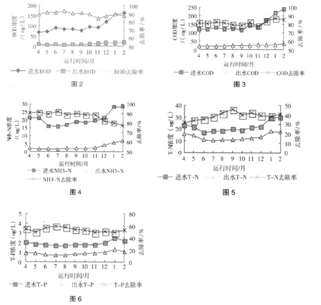 由以上各圖可知該廠的進水水質受季節影響較大,夏季豐水期污染物含量低,冬季枯水期污染物含量都有所升高。COD 和BOD 表現尤為明顯,夏季COD 月平均濃度只有110~120mg/L ,降雨時甚至低于60 mg/L,冬季COD 月平均濃度則可達到240mg/L 左右,最大值可達到360 mg/L 以上。BOD 隨著COD 的變化而變化,全年BOD/COD 值在0.58-0.74 之間。可見污水具有良好的可生化性,非常適合生物處理。6 月至11 月受用水量和降雨的影響,NH3- N 平均濃度只有15~18 mg/L,而TN 略高于NH3-N 一般在20 mg/L 左右。12 月到次年的2 月在南方是最冷的時候,用水量相對較少而且降雨也少,此時NH3- N 和TN 濃度均可達到30 mg/L。TP 受季節變化影響較小,月平均濃度在1.6-1.8 mg/L 之間,最高可達到2.5 mg/L 左右。盡管進水水質受季節和降雨的影響較大,但除NH3- N 去除率受氣溫影響而變化較大外,各污染物的去除率均能保持在比較穩定的范圍內。其根本原因在于AB 工藝的A 段屬于超高負荷活性污泥系統,具有很強的耐沖擊能力,可以保護B 段生物處理系統免遭破壞,進而使整個處理系統可以穩定高效地運行。由監測數據表明,該廠的出水水質均可達到城填污水綜合排放標準(GB18918-2002)一級B 標準,在夏季污染物濃度較低且氣溫較高的情況下甚至可以達到一級A 標準。