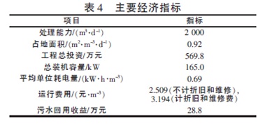 處理后的出水與其他廢水混和后可直接回用于循環(huán)冷卻水,回用水按照0.4 元/m3 計(jì)算(處理后的污水?dāng)M直接回用,不考慮中間少量的損耗),則每年節(jié)約廢水所帶來的直接經(jīng)濟(jì)效益為:2 000×360×0.4=288000 元。主要經(jīng)濟(jì)指標(biāo)見表4。