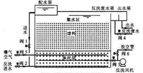 e、反沖洗配風系統也采用大阻力管式配氣方式。為保證有效沖洗,在承托層內均勻地布置了多排配氣管。