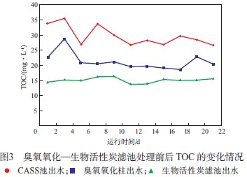 臭氧氧化—生物活性炭濾池處理前后 TOC的變化情況見圖 3。由圖 3 可見:臭氧氧化—生物活性炭濾池對 TOC 的削減規律與 COD 近似;CASS 池出水 TOC 為26.6~35.5 mg/L;經臭氧氧化后 TOC 下降至 18.6~28.7 mg/L,臭氧氧化柱的平均 TOC 去除率為 28.1%;臭氧氧化柱出水進一步經生物活性炭濾池處理后,TOC 下降到13.7~16.3 mg/L,平均為 15.1 mg/L,生物活性炭濾池的平均 TOC 去除率為 29.3%;系統平均總TOC 去除率為48.8%。
