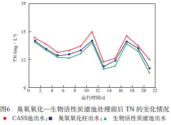 臭氧氧化—生物活性炭濾池處理前后 TN 的變化情況見圖 6。由圖 6 可見,CASS 池的出水 TN為 11.73~14.56 mg/L,經臭氧氧化后臭氧氧化柱出水 TN 為 11.06~14.05 mg/L,再經生物活性炭濾池處理后出水 TN 為 10.54~13.87 mg/L,系統對 TN的去除效果不明顯。這可能是由于臭氧出水中含有較高的溶解氧導致系統內溶解氧比較充足,不具備反硝化菌生長的條件,因此幾乎未發生反硝化,僅靠同化作用去除了少量總氮。