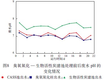 臭氧氧化—生物活性炭濾池處理前后廢水 pH的變化情況見圖 8。由圖 8 可見:CASS 池出水 pH為 6.85~7.28;臭氧氧化柱出水 pH 為6.81~7.18,平均下降 0.10。廢水 pH 的小幅下降可能是由于臭氧通過氧化作用將部分大分子有機物質分解為小分子有機酸或醛類物質所致。經生物活性炭濾池處理后,出水 pH 上升到 7.38~7.77,較臭氧氧化柱出水平均升高了 0.60。這可能是由于臭氧氧化生成的有機酸或醛類物質最終在生物氧化作用下轉變為 CO2 和 H2O,同時曝氣過程對 CO2具有吹脫作用。具體參見http://www.xhxdt.com更多相關技術文檔。