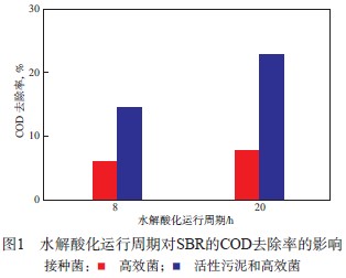 由圖1可見:活性污泥和高效菌SBR的COD去除率明顯高于高效菌SBR;當水解酸化運行周期由8 h增至20 h時,活性污泥和高效菌SBR的COD去除率由14.0%增至22.0%;高效菌SBR的COD去除率增加不明顯,均為6.0%左右。這是由于活性污泥和高效菌混合后,生物相更加豐富,通過環境的馴化能夠形成適合水解酸化處理濕法腈綸廢水的高效微生物菌群。