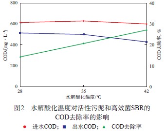 當水解酸化運行周期為20 h時,水解酸化溫度對活性污泥和高效菌SBR的COD去除率的影響見圖2。由圖2可見:隨水解酸化溫度的升高,COD去除率逐漸增加;當水解酸化溫度為42℃時,COD去除率為26.0%,BOD5/COD由0.37提高至0.39。由于傳統活性污泥法的最高反應溫度為35℃[12],為此廢水廠需對廢水進行降溫。而本方法可在較高溫度下進行,既有效提高了水解酸化工段的處理效果又降低了處理成本。