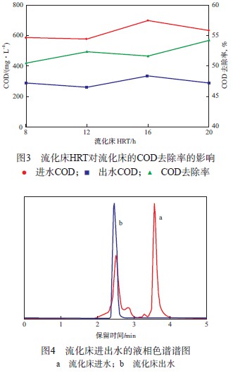 流化床HRT對流化床的COD去除率的影響見圖3。由圖3可見:隨流化床HRT的增加,COD去除率略有增加;當流化床HRT為20 h時,流化床的COD去除率為54%,出水COD降至300 mg/L左右。由此可見,延長流化床HRT有助于提高COD的去除率。