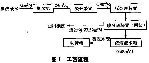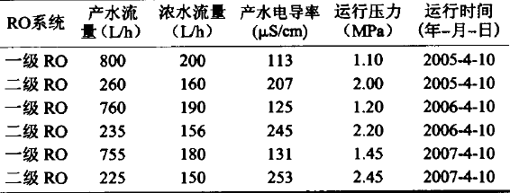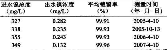 反滲透膜系統(tǒng)處理后的出水主要回用于鍍鎳漂洗水,由于鍍鎳液的工作溫度為55—60"C,在電鍍過(guò)程中有大量水分蒸發(fā),故在RO裝置濃液排出的稀鍍鎳液(量少時(shí))可順利加入鍍鎳槽中回用。整個(gè)系統(tǒng)從2005年4月運(yùn)行至今,系統(tǒng)運(yùn)行平穩(wěn),各項(xiàng)指標(biāo)均基本達(dá)到設(shè)計(jì)要求,系統(tǒng)運(yùn)行參數(shù)見(jiàn)表1。