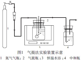 將裝有 15 L 油田廢水的氣提瓶置于一定溫度的恒溫水浴中,通過伸入廢水底部的導管向氣提瓶中通入一定流量的氮氣,使油田廢水中溶解的 H2S擴散到氮氣中隨尾氣排出,尾氣通入裝有飽和氫氧化鈣溶液的中和瓶中,使 H2S 與氫氧化鈣反應。反應一定時間后,取樣測定氣提瓶中油田廢水的 H2S質量濃度,計算 H2S 去除率。用鹽酸調節油田廢水pH,向油田廢水中加入少量石油,攪拌得到不同含油量的廢水,進行條件實驗。氣提法實驗裝置示意見圖 1。