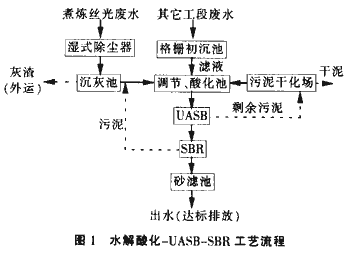 該工藝流程如圖1,已在綿陽和成都2家印染廠應用成功,在運行過程中,用高濃度、高堿度的煮煉和絲光廢水取代清水加堿的脫硫除塵用水,達到以廢治廢的效果;采用調節池和酸化池共建,既保證了調節池容量的足夠大,解決了印染廢水多變化的難題,又節約占地和投資;由SBR排出的剩余污泥不是直接排放,而是返回了調節酸化池,在進入UASB反應池以厭氧消化后再排放,這種污泥回流處理方式可使污泥基本實現穩定,易脫水,不發臭,可直接用作肥料,處理效果見表2。具體參見http://www.xhxdt.com更多相關技術文檔。