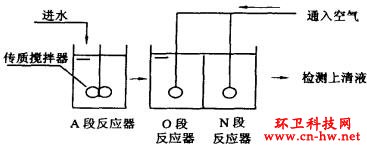 有機物降解和脫N靜態試驗結果表明,對于含N量較高的公廁化糞池排水,旅游區污水處理采用A/O工藝可有效去除其中的有機污染成分(COD和BOD去除率在84%以上),但對TN的去除能力較低,僅為50%左右,出水中NH3-N和TN的含量分別為64mg/L和80mg/L,出水中NH3-N含量占總含氮量的80%。根據傳統生物脫氮機理對試驗結果進行分析,導致脫N效率低的原因與以下幾個方面有關:a.O段內硝化過程效率很低,出水中NH3-N在TN中占有很大比例(80%),這與硝化反應和有機物生物降解反應在完全混合型好氧反應器內同時進行有關;b.由于進水的C/N比值較低,反硝化反應器中的碳源不足或碳源利用率低。為解決上述問題,對A/O試驗工藝流程作如下改進:a.將完全混合型的好氧反應器分為兩格,第一格為碳氧化反應區,第二格為硝化反應區,將反應器的工作方式由完全混合式變為推流式,有利于改善生長速度較慢的自養型硝化菌的生態位,促進其生長,從而提高硝化反應效率;b.在A段反應器中增設傳質攪拌器,提高碳源利用率。