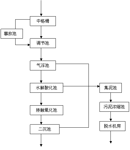 奶制品廢水集中排入格柵間,首先通過格柵去除較大的顆粒懸浮物,后自流入調節池使廢水的水質和水量調節均衡,出水經過提升泵進入水解酸化池進行反應,再由水解酸化池進入接觸氧化池,最后進入二沉池,二沉池出水達標排放,排出污泥進入污泥處理設備,最終污泥外運。
