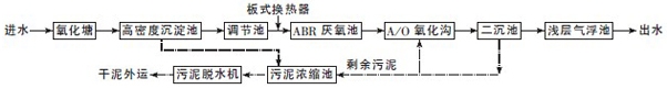 根據該公司的廢水特點,同時結合該企業的廢水處理可用地現狀,本項目采用氧化塘-高效沉淀-ABR-A/O 氧化溝-淺層氣浮的處理工藝,具體設計工藝流程見圖1。