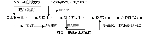 針對原廢水處理存在的實際問題,經多方面的研究和實驗測試,證明脫脂的含油廢水預先在線加熱破乳或酸化破乳除油后,將大量CODCr、油去除后,再進入廢水站進行處理,可以大大減輕廢水站的負荷;同時在反應池A中,選用FeCl3•6H2O混凝劑與高分子絮凝劑PAM反應,在反應池B中直接用硫酸調節廢水的pH在6~9的范圍即可。工藝流程見圖2。