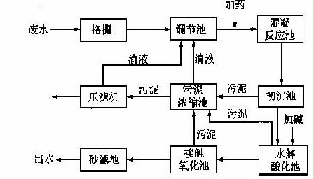 廢水經格柵攔截雜物后進入調節池,由潛水泵提升到混凝反應池,無機混凝劑PAC和有機絮凝劑CG-A由計量泵泵入提升管道與廢水進行有效地混合,混凝反應器采用平推流式,反應渠的截面積逐漸增大以實現漸減混凝。然后廢水進入沉淀池完成固液分離,清液在進入水解酸化池前視水質情況加堿調節到pH在8~9之間,經過水解酸化、接觸氧化、砂濾后出水。