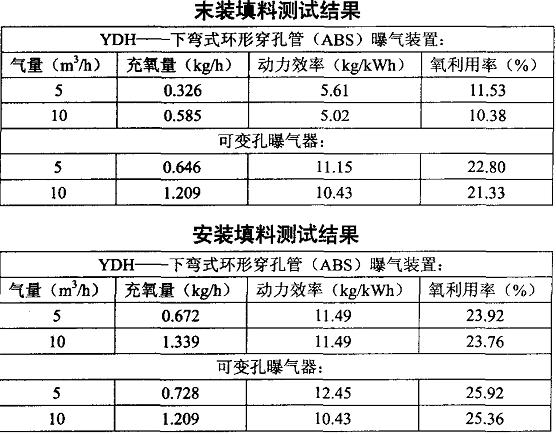 高于可變孔曝氣器的情況出現。(見左下表)上述表格中的數據出現并非是偶然的,我們通過試驗池玻璃窗直接觀察發現:微氣泡在上升過程中不會破碎,甚至有不斷聚合的情況。但大氣泡在上升過程中由于填料碰撞切割而破碎,監因此增加了水體紊動,提高了傳質效果,從而進一步提高了氧的轉移速率。而氣泡在破碎的瞬間,氧的轉移速率是最高的。因此設計人員在設計時,應充分考慮影響氧的利用率的諸多因素,不能僅從清水充氧i貝『J試結果來判斷決定。