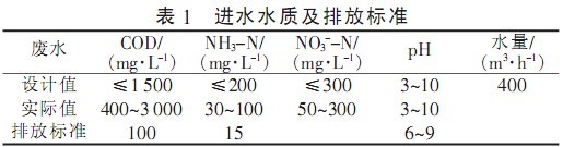 生產廢水首先進入調節池調節水質水量然后由提升泵提升至初沉池去除廢水中的SS出水自流進3T-AF池在3T-AF池內進行反硝化以去除廢水中的NO3--NNO2--N和部分COD同時通過厭氧作用提高廢水的可生化性3T-AF池出水進入A/O池進一步去除氨氮和有機物O池的出水部分回流至A池進行反硝化脫除總氮并將二沉池的部分污泥回流至A池保持整套A/O系統的污泥濃度在O池中通過硝化菌的作用將氨氮轉化成NO3--N和NO2--NO池中的硝化液回流至A池中進行反硝化脫氮控制回流比21左右二沉池出水達標排放。主要構筑物和參數見表2。