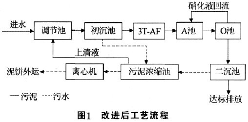 3T-AF 中的高效微生物是通過人工篩選馴化復壯的專用工程復合菌由多種微生物和復合酶配置而成對大分子難降解毒性大的污染物有較強的降解能力和適應性 3T-AF 是通過生物活性分子固定化技術將大量微生物和酶固定在載體上進行厭氧反應 由此可以提高廢水的可生化性并降解部分有機物 相對于水解酸化池 3T-AF 不只進行水解酸化反應 同時對有機物的降解具有很大的貢獻。改進后的工藝流程見圖1。