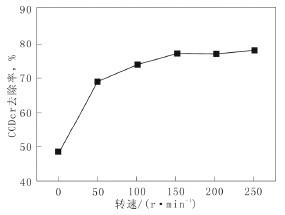由圖5可以看出,CODCr去除率隨攪拌強度先增加,后趨于穩定。這是由于Fe2+作為催化劑,最終被氧化成Fe3+,在一定pH值下,生成Fe(OH)3膠體,它有絮凝作用,可降低水中的懸浮物,但絮凝作用有限,當攪拌強度增加到150r/min后,CODCr去除率趨于平緩。