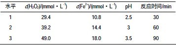 在前面單因素試驗研究的基礎上,進行四因素三水平的正交試驗,正交表見表2,其試驗結果如表3所示,從表3通過數據分析可得出極差大小:c(H2O2)>pH>反應時間>c(Fe2+),表明Fenton法處理腈綸生化出水時,H2O2的投加量對CODCr去除率影響最大,其次pH值,然后是Fe2+的濃度,最后才是反應時間。