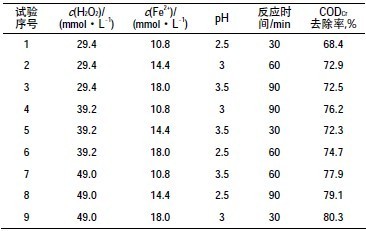 取干法腈綸生化出水1000mL置于2000mL燒杯中,用硫酸或氫氧化鈉調節pH值,投加一定量的H2O2和FeSO4•7H2O,利用磁力攪拌器攪拌一定時間。為消除Fe2+和H2O2對水樣CODCr值的影響,待反應完畢后,用濃的氫氧化鈉溶液調節水樣使pH=10.0±0.5,靜置1h使氫氧化鐵沉淀完全,取上層清液測定水樣的水質指標。進行單因素試驗確定因素變化規律,最后進行正交試驗確定最佳反應條件。