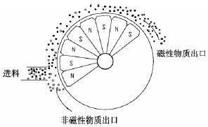 含有磁粉和污泥的污水從轉(zhuǎn)鼓的一端進(jìn)入分離裝置,固定磁極將磁性顆粒吸出并附著在滾筒表面,隨著滾筒的轉(zhuǎn)動(dòng),被帶至磁系邊緣的低磁區(qū),并從磁性物質(zhì)出口卸下,非磁性物質(zhì)則在重力的作用下,沿分離槽流至非磁性物質(zhì)出口排出,完成磁性物質(zhì)和非磁性物質(zhì)的分離過(guò)程。