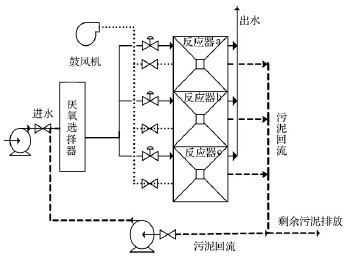 實驗裝置由前置厭氧反應器、3 個序批式(SBR) 反應器兩部分構成(見圖1),每個SBR中設有泥斗。其單體有效容積分別為10 m3和33 m3 (單個SBR泥斗容積約3. 6 m3) 。SBR池內設進水管、微孔曝氣裝置和潷氺器,選擇器內設攪拌裝置。進水、污泥回流通過兩臺泵控制。由電磁閥和空氣閥分別控制SBR的進水、污泥回流(轉移)、出水和曝氣,所有閥門和水泵的啟閉均采用PLC 自動控制。