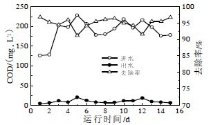 圖 為反滲透系統進水和產水的COD 的變化圖,產水COD 的含量在4~20 mg/L 之間,系統對COD 的去除率在91%以上,去除效果明顯。