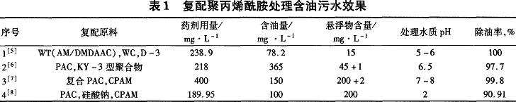 大量的實踐表明,若把兩種或兩種以上的絮凝劑通過分別投加而進行復配使用、或在一定條件下通過混合或反應形成一種復合絮凝劑產品使用,藥劑間具有“協同效應”,可提高藥劑單獨使用的效果。CPAM的處理效果好于元機絮凝劑,但其成本高,單獨使用無機絮凝劑其加藥量又太大。表1列出了已知的幾種配方成分復配藥劑處理油田污水效果。