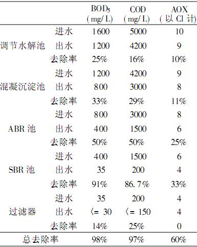 綜上分析,本項目采用水解酸化+混凝沉淀+離子氧化+ABR+SBR的組合處理工藝,其對環氧氯丙烷,二氯甲烷,AOX等有較好的去除效率,總的去除效率達60%以上。