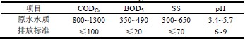 湖南某食品股份有限公司是一家以果蔬食品加工為主、兼顧從事果蔬食品的科研、生產、經營的現代農業公司,建有一條2萬t/a 糖水桔子罐頭加工生產線。柑橘罐頭的加工工序包括柑桔的清洗、熱燙、酸處理、堿處理、清漂、殺菌、洗瓶、樣品檢驗等,其排放的廢水主要來源于酸泡脫桔梗及桔膜、桔片堿泡調和生產過程,廢水中主要含有COD、BOD5 、SS 、色度等污染物。柑橘罐頭加工廢水與員工生活污水一起構成本設計廢水來源。廢水設計水量為3300 m3/d,原水水質及排放標準如表1。