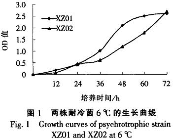 (1)按照試驗要求篩選到2株耐冷菌XZ01和XZ02,在6℃低溫下72h內的比生長速率較大。分別為0.070和0.075h~,活性相對較高。