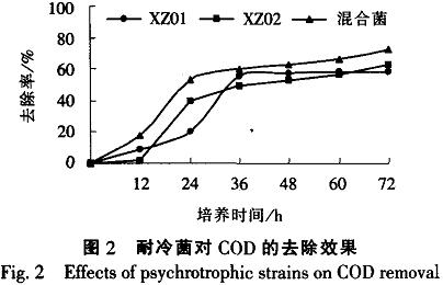 由圖2可以看出,分離到的2株菌在低溫下均能降解水中有機物,XZ01菌株在培養24h進入對數期,48h后去除率趨于穩定.COD去除率為58.4%;而XZ02菌株在培養12h就進入對數期,隨后COD去除率一直呈現上升趨勢,COD去除率可達63.0%;而混合菌對COD去除率可達72.8%,這是因為COD法測定的是水中的全部有機物質,水中的有機物種類較多,單一菌只能有效降解其中的幾種有機物,因而混合菌株對COD去除率較高。