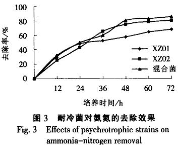 由圖3可知,2株耐冷菌對氨氮均有較高的去除率。XZ01菌株前期生長代謝能力較XZ02菌株稍強.后期較為緩慢,這可能與硝態氮的積累有關:XZ02菌株培養24h后代謝活性逐步增強,氨氮去除率高達80.6%,這說明該菌株對氨氮的利用有較高專一性:混合菌株對氨氮去除率可達86.1%,比XZ02菌株去除率略高,這說明XZ02菌株在其中起到了關鍵的作用。