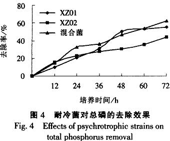 磷是微生物生長的必需元素之一,伴隨著有機物的降解和微生物菌體的形成,從而有效地達到去除磷的效果。XZ01和XZ02菌株在生長代謝過程中需攝取一定量的磷。由圖4可知,2株耐冷菌對磷的代謝活性都不高。XZ01菌株代謝活性略高于XZ02菌株。其總磷去除率分別為54.9%和43.6%混合菌株對總磷去除率為62.3%,比單一菌株有較大提高。這說明這2種菌株之間有一定的協同作用,減輕了中間產物的負反饋抑制,使總磷的利用更徹底,因此混合菌對污水中總磷的去除效果比單菌種的效果好。具體參見http://www.xhxdt.com更多相關技術文檔。