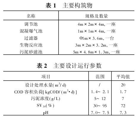 原水首先進入調(diào)節(jié)池,調(diào)節(jié)池為混凝土結(jié)構(gòu),有效容積20m3,能夠容納一天的水量,其作用是均衡進水的水量和水質(zhì),特別是控制污染物的均衡。混凝曝氣池和調(diào)節(jié)池合建,底部連通,原水在混凝曝氣池中加藥混凝并曝氣,用NaOH調(diào)pH值后,通過水泵輸送入過濾器(過濾器下進水、上出水,升流式運行,濾料為Φ2mm的聚苯乙烯球)。經(jīng)過濾器過濾后,SS基本完全去除。物化處理后,廢水的可生化性提高,依靠重力作用流入膜生物反應(yīng)器(膜生物反應(yīng)器系統(tǒng)由中空纖維膜組件、曝氣系統(tǒng)、出水收集系統(tǒng)和自動控制箱組成),經(jīng)活性污泥曝氣生化處理后,借助重力出水,實現(xiàn)固液分離。調(diào)節(jié)池、過濾器和膜生物反應(yīng)器的污泥全部排至污泥砂濾池,污泥砂濾池為混凝土結(jié)構(gòu),有效容積6m3。主要構(gòu)筑物尺寸見表1,主要設(shè)計運行參數(shù)見表2。