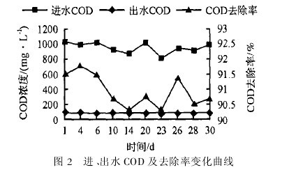 圖2為膜生物反應(yīng)器進、出水COD及COD去除率變化曲線。